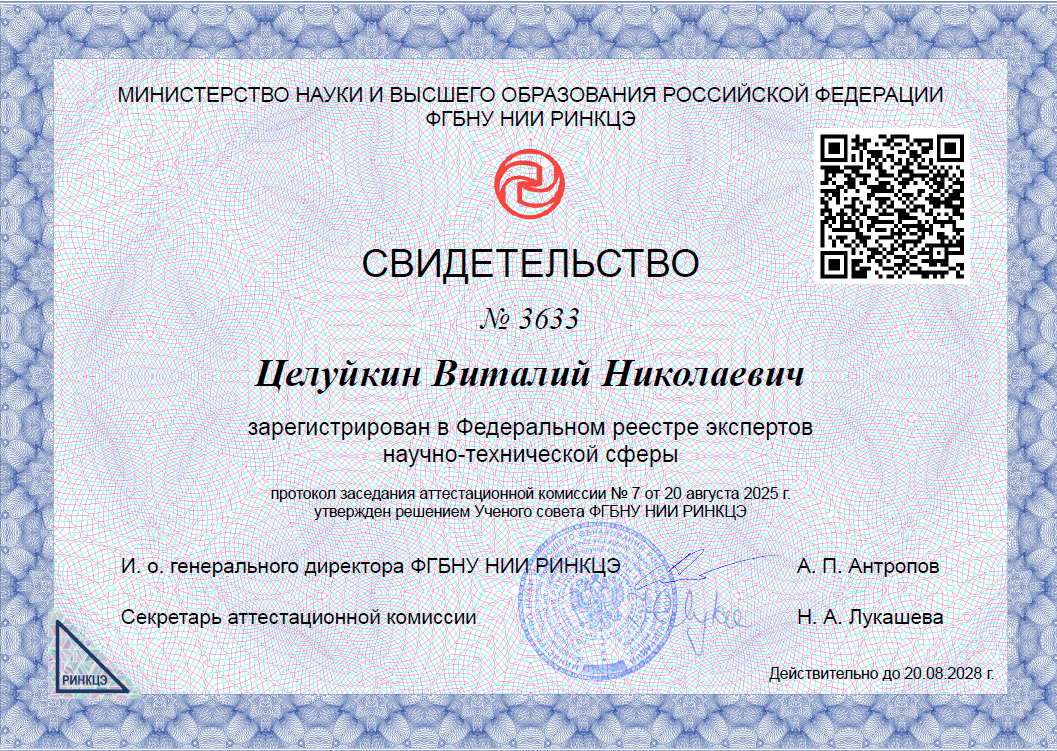 Профессор кафедры ТОХП, доктор технических наук Виталий Николаевич Целуйкин зарегистрирован в Федеральном реестре экспертов научно-технической сферы Минобрнауки России.