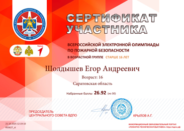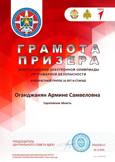Оганджанян Армине добилась значительного успеха, став призером Всероссийской электронной олимпиады по пожарной безопасности. Необходимо отметить, что Армине стала единственным призером от Саратовской области в возрастной категории 16 лет и старше.