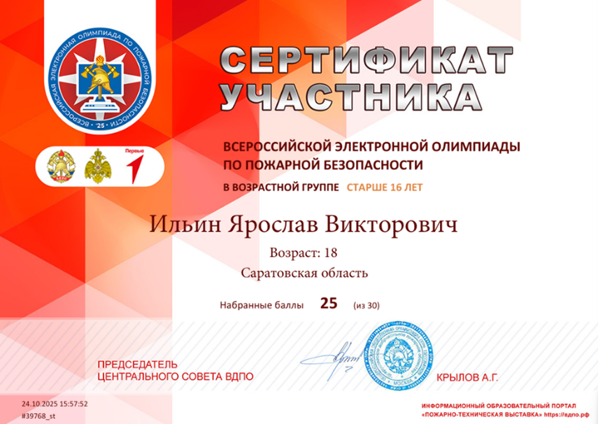 Подведены итоги Всероссийской электронной олимпиады по пожарной безопасности, в которой приняли участие студенты 1 курса, обучающиеся по программам среднего профессионально образования: Оганджанян Армине (ИСП-11), Шолдышев Егор (ИСП-12), Ильин Ярослав (МТО-12). Олимпиада, направленная на повышение культуры безопасного поведения и углубление знаний в области пожарной профилактики, истории пожарной охраны и МЧС России, истории пожарного добровольчества, собрала 525 000 участников со всей страны.