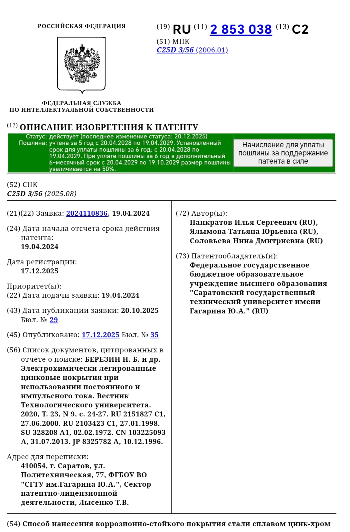 Пат. 2853038 Российская Федерация, МПК C 25 D 3/56. Способ нанесения коррозионно-стойкого покрытия стали сплавом цинк-хром / Панкратов И.С., Ялымова Т.Ю., Соловьева Н.Д.; заявитель и патентообладатель Федеральное государственное бюджетное образовательное учреждение высшего образования "Саратовский государственный технический университет имени Гагарина Ю.А.". - № 2024110836; заявл. 19 апреля 2024 года ; публ.17.12.2025, Бюл. № 35. - 6 с.