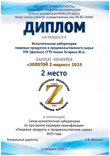- 2 место (лауреат конкурса 2 место) Испытательная лаборатория пищевых продуктов и продовольственного сырья ЭТИ (филиал) СГТУ имени Ю. А. Гагарина