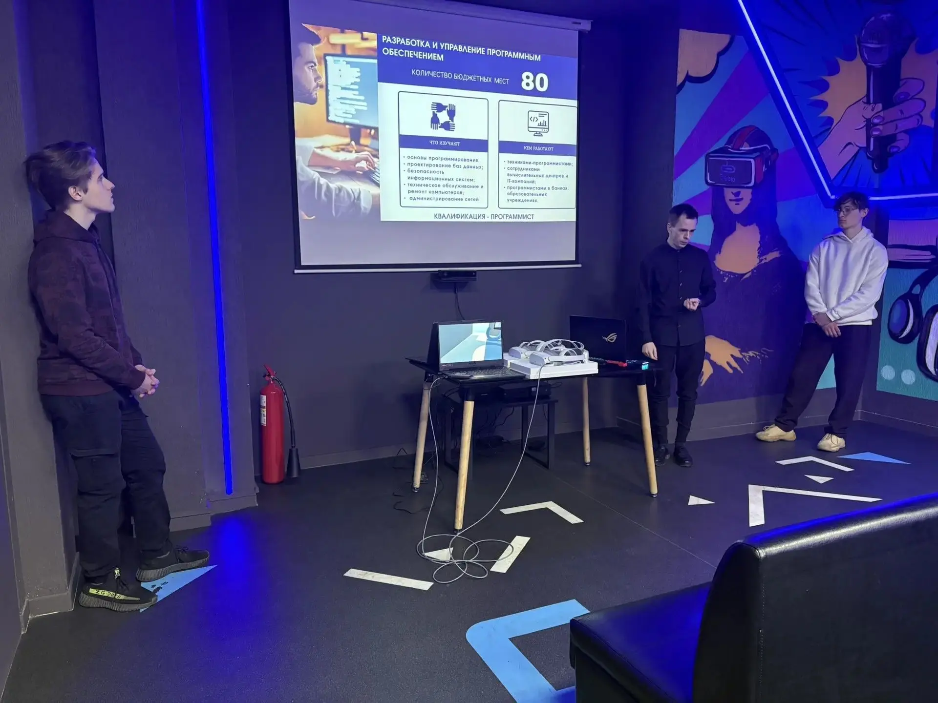 Помимо соревнований, школьники познакомились с образовательным потенциалом института. Алексей Зотов рассказал о перспективных направлениях обучения в ЭТИ, а студенты продемонстрировали свои авторские ИТ-разработки. Никита Копылов (ИСП-42) провел мастер-класс по работе со своим приложением «VR-архитектор», а Савва Шкуратов (ИСП-31) представил интеллектуального голосового помощника «Джарвис».