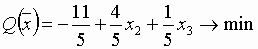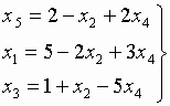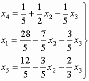 Значение целевой функции можно уменьшить за счет увеличения x5. При увеличении x5 величина x1 также увеличивается, а x2 и x3 – уменьшаются. Причем величина x2 раньше может стать отрицательной. Поэтому, вводя в базис переменную x5, одновременно x2 исключаем из базиса. В результате после очевидных преобразований получим следующие выражения для новой системы базисных переменных и целевой функции: