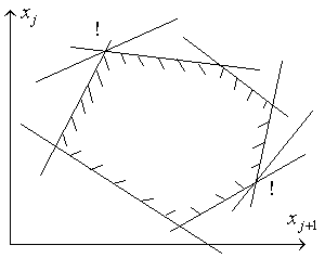 Рассматривая симплекс-метод, мы предполагали, что задача линейного программирования является невырожденной, т.е. каждый опорный план содержит ровно m положительных компонент, где m – число ограничений в задаче. В вырожденном опорном плане число положительных компонент оказывается меньше числа ограничений: некоторые базисные переменные, соответствующие данному опорному плану, принимают нулевые значения. Используя геометрическую интерпретацию для простейшего случая, когда n - m = 2 (число небазисных переменных равно 2), легко отличить вырожденную задачу от невырожденной. В вырожденной задаче в одной вершине многогранника условий пересекается более двух прямых, описываемых уравнениями вида xi = 0. Это значит, что одна или несколько сторон многоугольника условий стягиваются в точку.