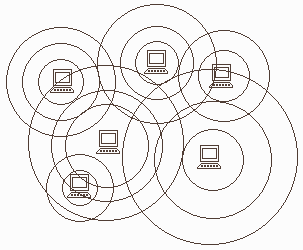 В этих случаях сеть реализуется при помощи сетевых радио-адаптеров, снабжённых всенаправленными антеннами и использующих в качестве среды передачи информации радиоволны. Такая сеть реализуется топологией “Все-Со-Всеми” и работоспособна при дальности 50–200 м.